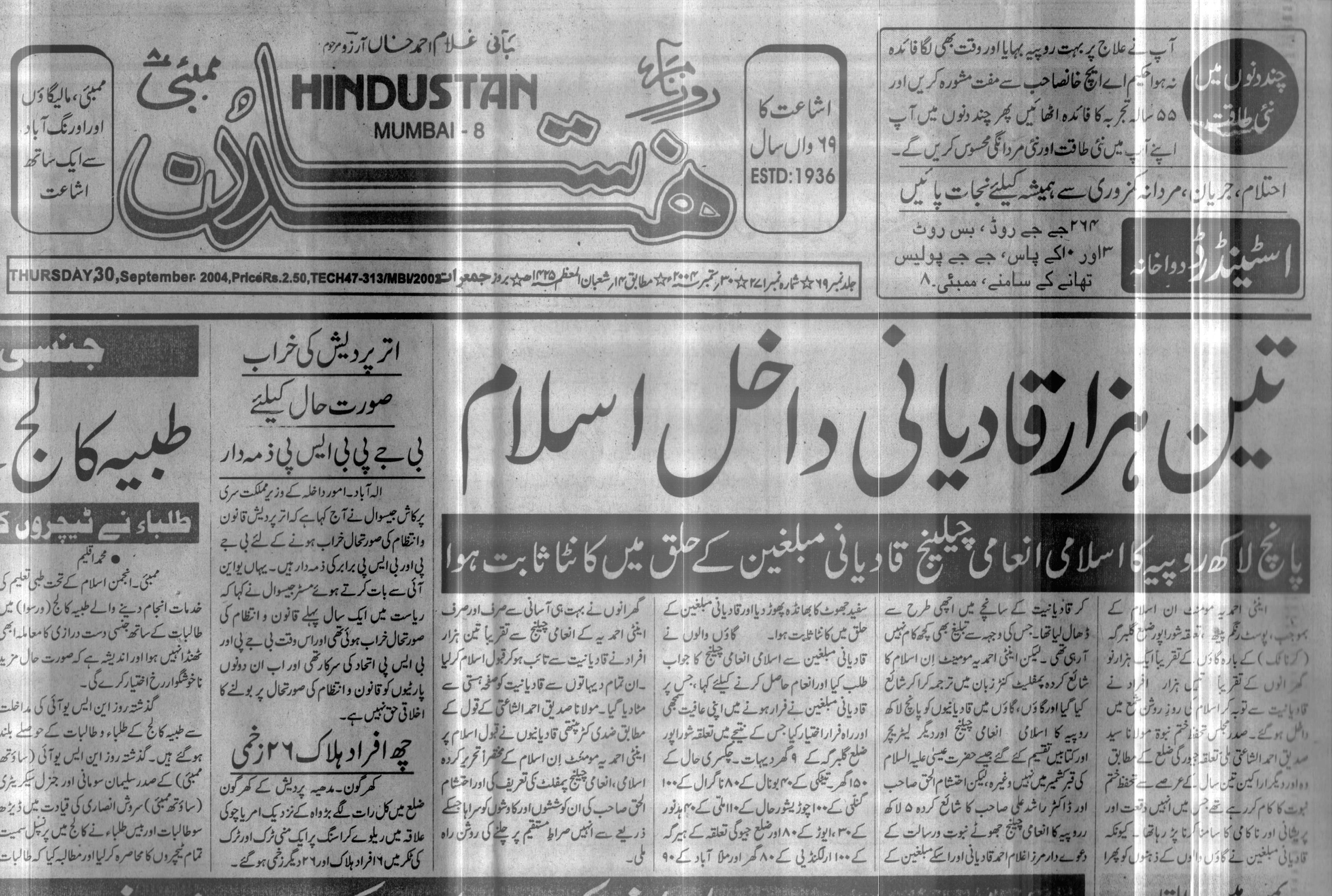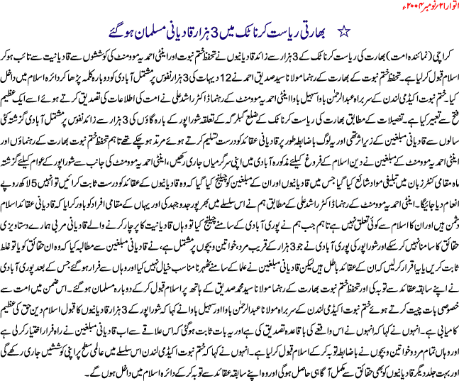 According to the news published in Daily Hindustan, Mumbai Vol. 69 No. 271 dated 30 September 2004, 3000 Ahmadis/Qadianis belonging to 1000 households living in 12 villages of Post Rangam Peth, Taluka Shorapur, District Gulbarga (Karnatak), India, have embraced Islam after denouncing Ahmadiyyat. Qadiani muballighs have been working for years in these villages and had converted entire Muslim population of these villages to Ahmadiyyat. Maulana Syed Siddiq Ahmed of Khatme Nabuwwat along with his associates have been working hard to revert them to Islam without much success. Ahmadi muballighs had brain washed these simple villager who refused to listen to any reasoning. However recently Anti Ahmadiyya literature prepared by Dr. Syed Rashid Ali and Ahteshamul Haq Abdul Bari (former Ahmadi) was translated into local Kunar language and distributed among these villagers. Among them was the Pamphlet offering Rs. 5 lacs reward to any Ahmadi who would prove the quotations from the books of Mirza Ghulam therein to be wrong. Local villagers after reading this pamphlet asked the Ahmadi muballighs to reply to this challenge and claim the reward. Ahmadis preachers tried their best to avoid this issue but the villagers kept pressing them. Finally the Ahmadi Muballighs packed up and ran away from these villages. It was then that they realised that these preachers have been deceiving them and then the entire Ahmadi/Qadiani convert community denounced Ahmadiyyat and embraced Islam at the hands of local Khatme Nabuwwat leader, Maulana Syed Siddiq Ahmed. Praise be to Allah for that.