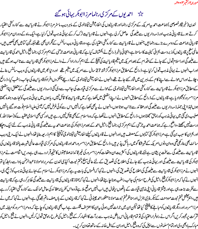Meanwhile, Ummat had contacted Maulana Abdur Rehman Bawa, an international preacher and leader of Khatme Nabuwwat Academy, London UK and he confirmed the news of Mirza Abu Bakr's exodus from Jamaat Ahmadiyya and joining Bahai faith. He expressed sorrow that Mirza Abu Bakr had preferred Bahai faith over Islam. He said that like Sh Raheel Ahmad, Mirza Abu Bakr should have reverted to Islam. He said that departure of prominent Qadianis from Ahmadiyyat indicate that repulsion to Qadianism is increasing and most Qadianis are hostage at the hands of its religious leadership, now they had found a chance to disengage from this jamaat of heretical beliefs. Secretary General of International Khatme Nabuwwat Movement and Munazir-e-Khatme Nabuwwat, Maulana Manzoor Ahmad Chinioti said that Qadianis have been wailing at this situation. He said that he had challenged Mirza Masroor Ahmad and other Qadianis for a prayer-duel (mubahila) but they could not dare to accept it. This is an admission of their defeat; even now Qadianis should force Mirza Masroor Ahmad to accept this challenge of mubahila. If he runs away, then all Qadianis should denounce this false creed, like Shaikh Raheel Ahmad and embrace the true path. He congratulated Shaikh Raheel Ahmad and appealed to all Muslims to cooperate with Shaikh Raheel Ahmad and his family.
