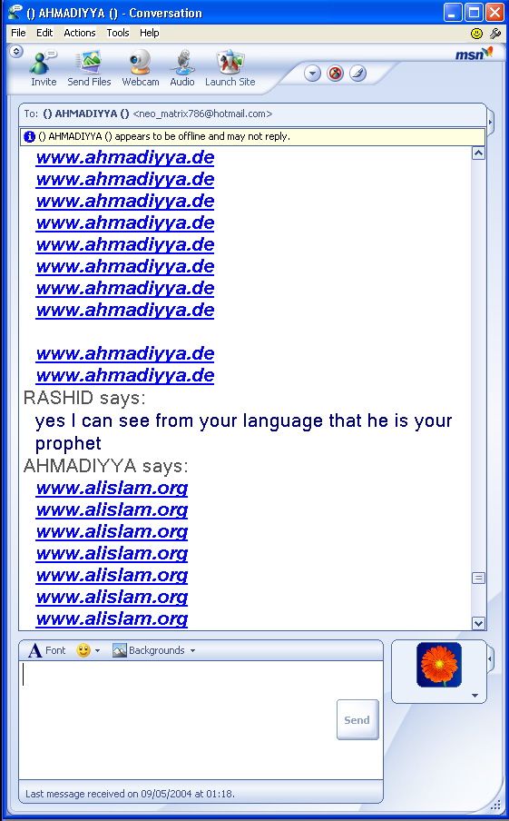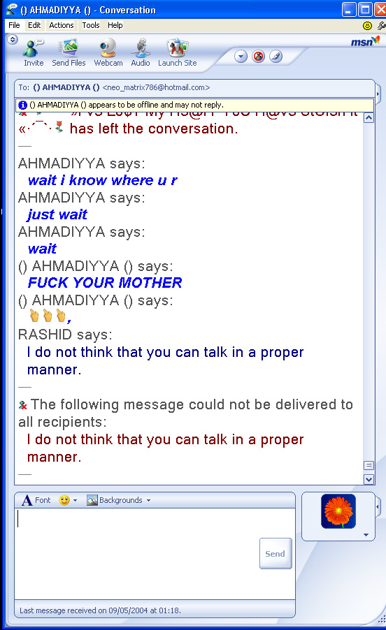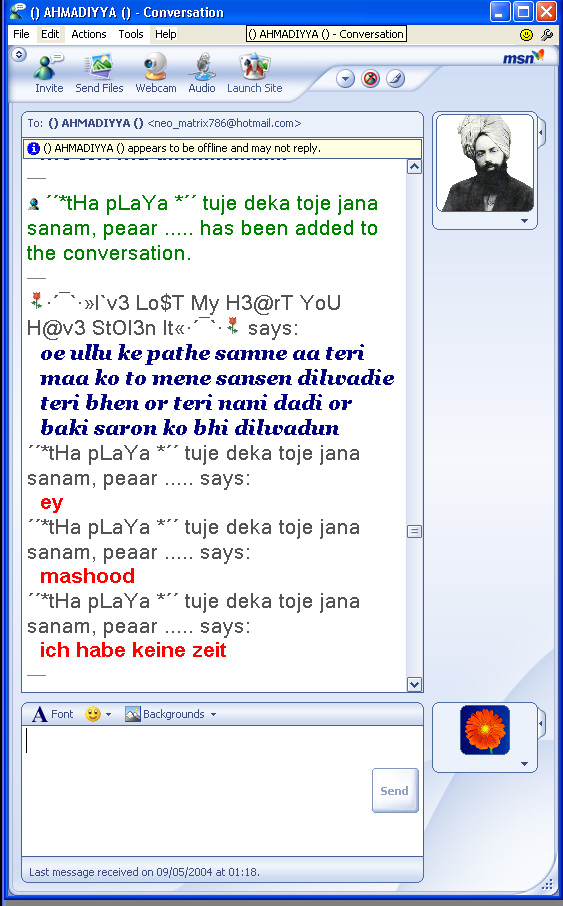 Recently someone added my hotmail ID to his list and as soon as I got online. He started chatting with me. Following is an excerpt of this chatting alongwith some of the images of this chatting. Note the abusive and very filthy language used by him, language which I can note dare to translate.