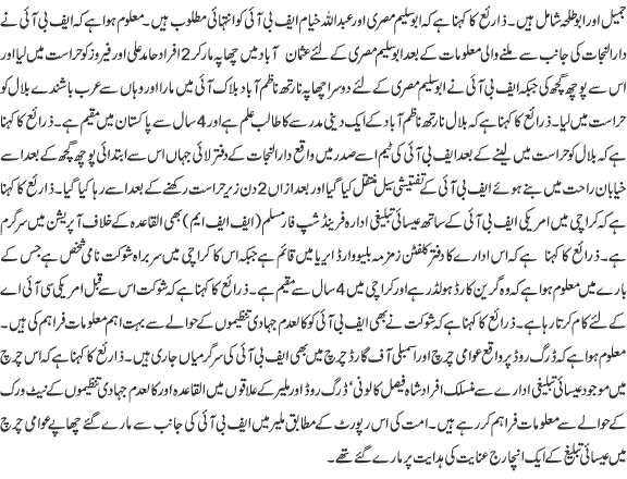 It is learnt that FBI activities are also going on in Public Church and Assembly of God Church, located on Drigh Road. Sources say that people affiliated with the missionary organisations working in these churches are obtaining informations regarding Al-Qaeda and banned Jehadi organisations network in Shah Faisal Colony, Drigh Road and Malir area. According to this report of Ummat the raids conducted by FBI in Malir area were done at the instructions of one of the christian missionary incharge, Inayat, of Public Church.