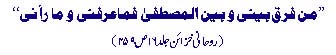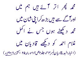 «Mon chef (Mirza) était aussi annihilé par l’amour (Ishq) envers le Prophète (SAW). Ces mêmes sentiments sont ainsi exprimés dans sa poésie en urdu :Us nur pay fida hoon, us kaa hee main hoowa hoonet quand il exprime sa passion (Ishq) en persan , voici ce qu’il dit :