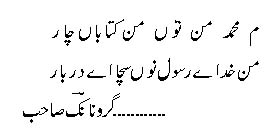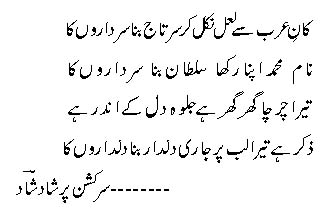 Woh hay, main cheese kya hoon, bus faisla yehi hayhust jam-e-ishq-e-oo Aab-e-Hayat la zawaalEt ses émotions sont toujours pleines d’amour passionné envers le Saint Prophète (SAW); il a exprimé son Ishq en arabe :