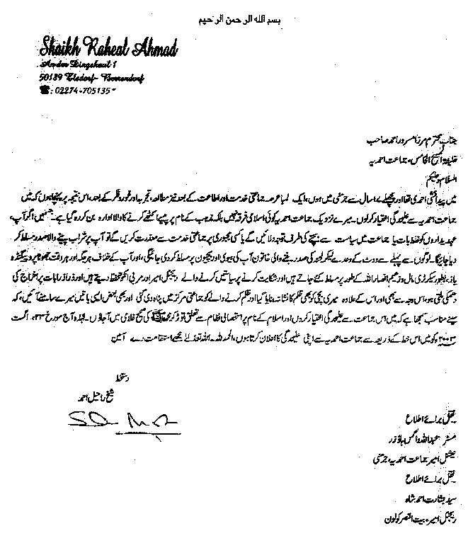 I was a born Ahmadi and is in Germany for the last 17 years. After a long time serving and obeying the Jamaat, and moreover after studying, observing, a lot of contemplating, I have reached this conclusion that I should break off from Jamaat Ahmadiyya. In my opinion Jamaat Ahmadiyya is not an Islamic sect, rather it has become a money collecting organisation in the name of religion; in which if one draws office bearers' attention to a wrong thing or advice the Jamaat to stay away from politics, then a boozer will made to reign over him, a lady who, had made pledge for votes to become the president of Lajna, will be made to govern over his wife and daughters; and against him such a person is appointed as Secretary Finance or Zaeem Ansarullah who is constantly engaged in making false propaganda everywhere, and upon complaining such persons are given protection by the scheming Regional Ameer and Murabbi, and on every small thing threatened with expulsions from Jamaat. It is for such reasons and also because my daughter was made a victim of brutality, and the tyrrant was given protection in the Center of Jamaat; some other such things have come into my knowledge that I thought fit to part my way from the Jamaat, and break my relation with this system of exploitation in the name of religion and come into the fold of true service of Holy Prophet Muhamade Arabi SallAllaho alaihe wassalam. Therefore today, 23rd August 2003, I announce my seperation from the Jamaat. AlHamdolillah. May Allah give me steadfastness. Ameen.